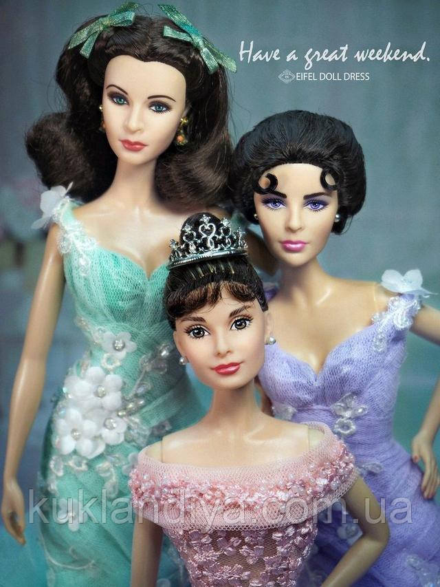 Лялька Елізабет Тейлор чудова в напівпрозорому шифоновому платті без рукавів, обтягнутому ліфом, з довгою спідницею з рельєфними краями. Відтінки фіолетового прекрасно доповнюють сяйливі фіолетові очі Тейлор. Це дуже вишукане плаття доповнюється приголомшливими прикрасами зі справжнім кристалом Swarovski®. Напрочуд гарні риси Елізабет Тейлор закарбовані з великою ясністю й деталями під час створення ляльки.